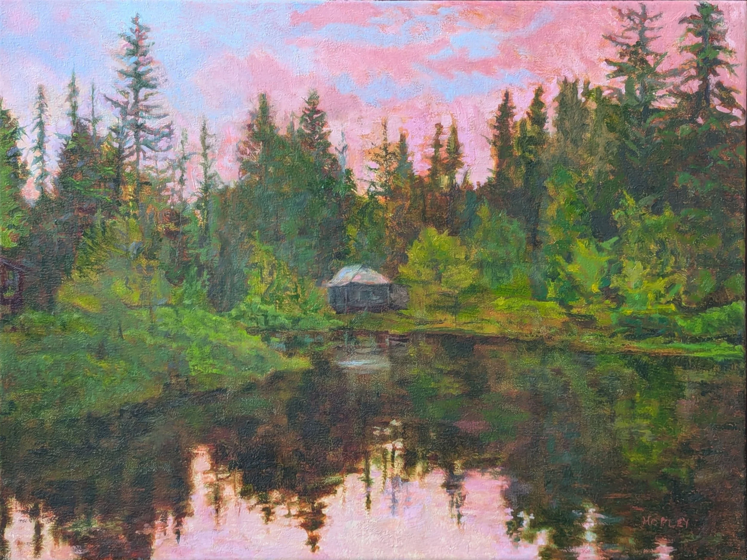 I love experiencing the early morning solitude here. The only sounds are the natural ones—the buzzy songs of the Pine Siskins and the chick-a-dee-dee-dee alarm call of the Black-capped Chickadees. I wanted to capture the light at this time, with soft colours of pink, gold, and green reflecting off the water like a mirror. The dense, dark B.C. forest frames the small, rustic cabin, deepening that sense of quiet.